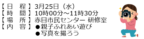 2026.03.092026.03.102026年3月25日(水)忍たま広場 まちづくりイベント生後間もなくから、幼稚園・保育所に入るまでのお子さんとその保護者の方が集う、楽しい子育て広場です。 2026年4月8日(水)忍たま広場前の記事 歴史をつなぐ 松明調達次の記事